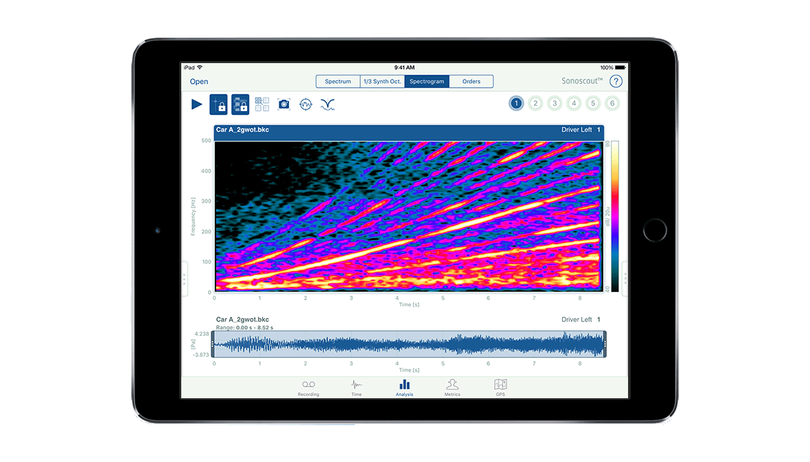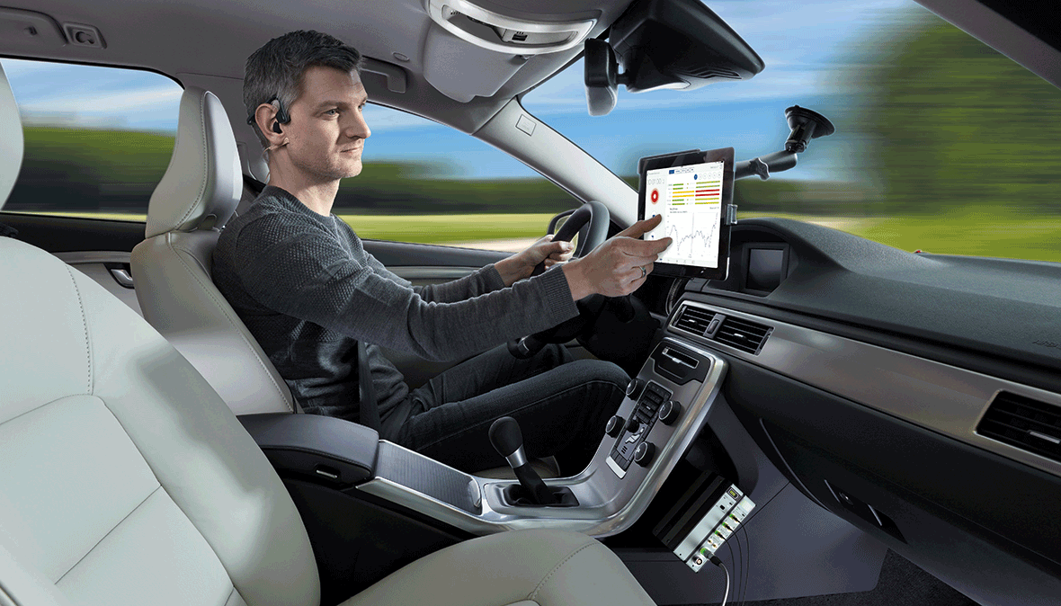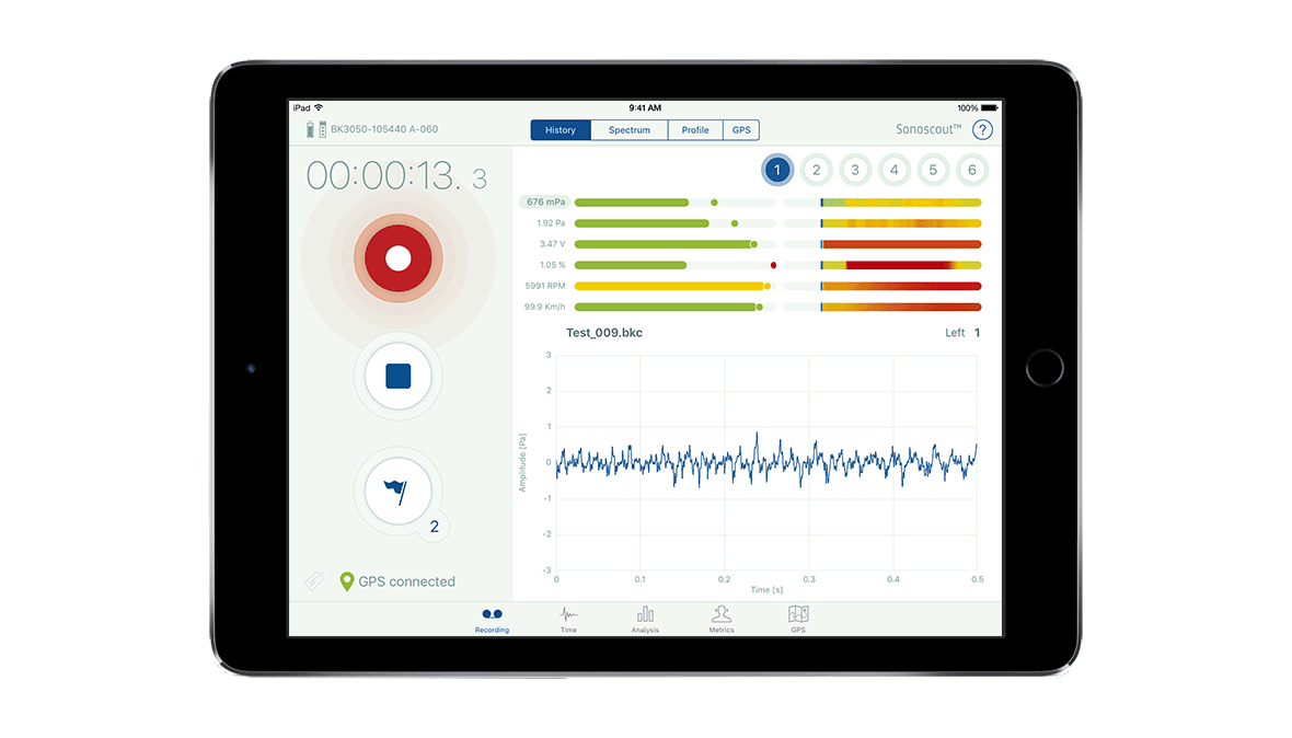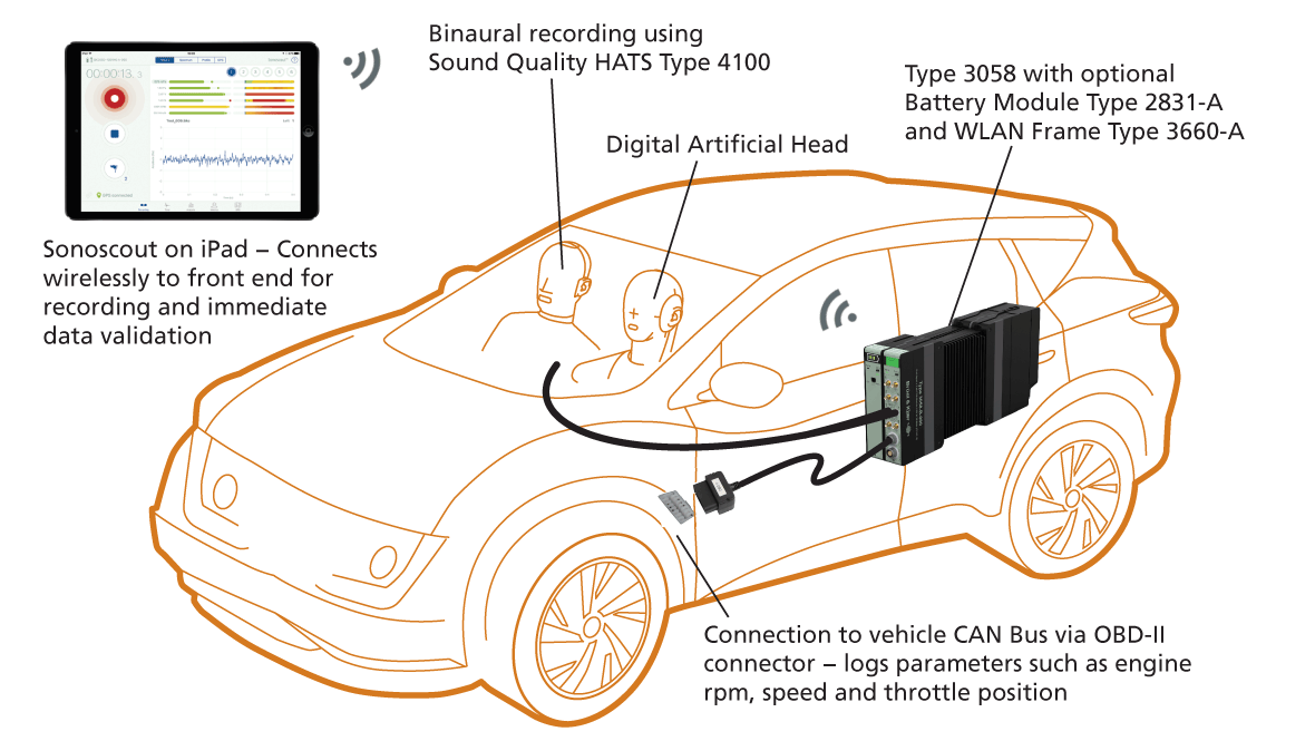 Das iPad kann im Fahrzeug am Armaturenbrett befestigt werden. Große Schaltflächen und übersichtliche Displays sind dabei hilfreich, die Tests zu kontrollieren und die verschiedenen Signale (akustische, Schwingungen, Drehzahl und CAN-Bus) zu visualisieren. Um die Sicherheit beim Fahren zu erhöhen, kann eine automatische Triggerung anhand von Pegel- oder GPS-Ereignissen erfolgen.