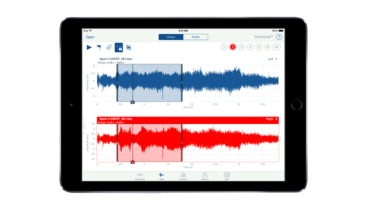 Das batteriebetriebene Frontend überträgt Daten an das iPad. Ohne WLAN kann die Aufzeichnung auch direkt auf die interne SD-Karte des Frontends erfolgen. Mit der intuitiven App ist es einfach, grundlegende Analysen auszuführen oder Aufnahmen abzuspielen und anzuhören, bevor die Dateien für eine weitere Analyse und zur Archivierung nach BK Connect und PULSE Reflex exportiert werden können.