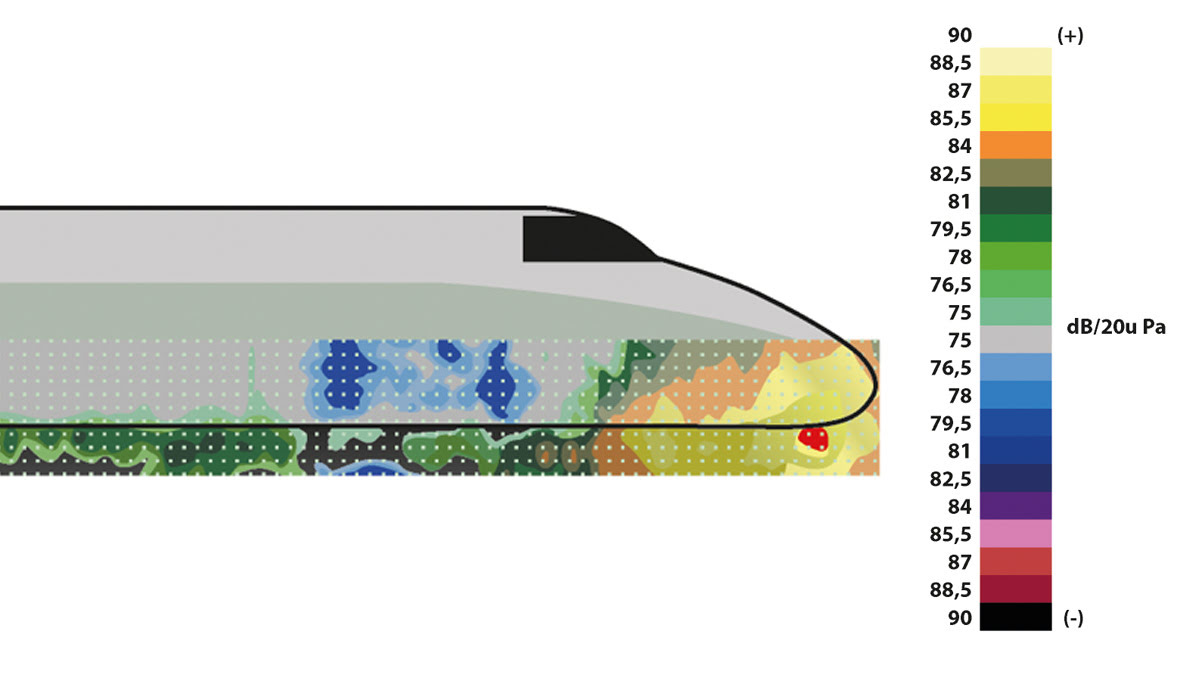 Mapping the whole or part of the rail vehicle enables differentiation between aerodynamic noise and rolling noise from the interaction of the wheels with the rails and rail sleepers. Smaller areas such as the pantograph can be targeted, and the contributed sound power can be calculated, thus enabling the user to easily rank the areas in order of importance. Identifying the most important sub-sources of noise such as inter-coach gangways in terms of position, frequency content and sound power radiation helps decide where design changes can most effectively reduce overall noise radiation – either reducing noise levels or optimizing their content and noise propagation.