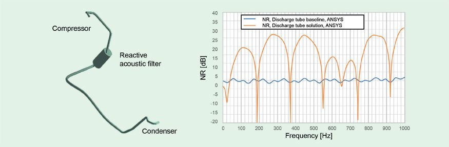 Considering the time available, the engineers decided to introduce a reactive acoustic filter in the high-pressure piping between the compressor and condenser. The volume was defined by numerical simulation, using the acoustic finite element method. The noise reduction was simulated and several filter configurations with different volumes were evaluated to meet the 15 dB attenuation criterion at around 130 Hz.