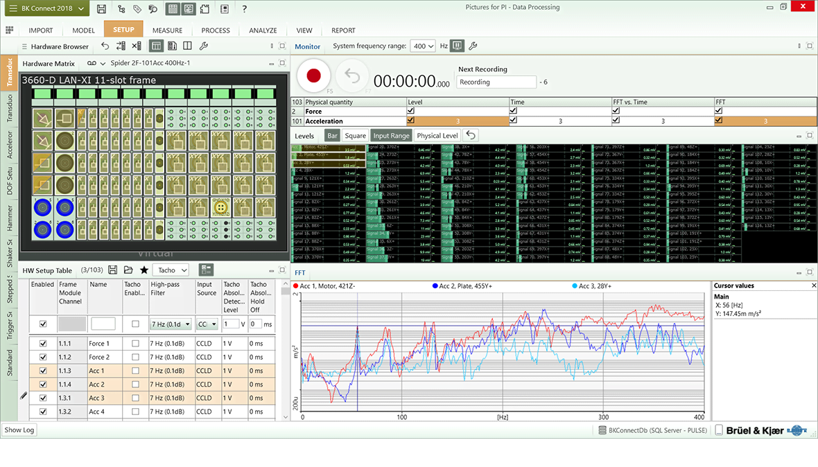 - Acquisition de données vibroacoustiques généralistes pour des analyses en utilisant les frontaux LAN-XI, ou LAN-XI Light. Bus CAN et voies d’entrée auxiliaires sont également supportés par le matériel compatible LAN-XI ou LAN-XI Light