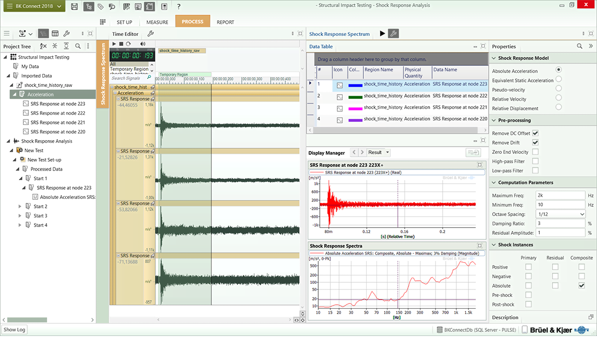 Ce logiciel inclut le prétraitement d’un choc. Les données d’entrée peuvent être visualisées avant que les chocs ne soient sélectionnés pour l’analyse. Avant les calculs de réponse au choc, ces chocs individuels peuvent corrigés en termes de dérive continue (DC) ou de décalage. La vitesse finale de l’entrée peut être forcée à zéro comme il est requis dans certaines applications. Il existe potentiellement 45 options différentes pour l’utilisateur : cinq modèles de spectre de réponse au choc et neuf calculs d’amplitude (instances de choc).