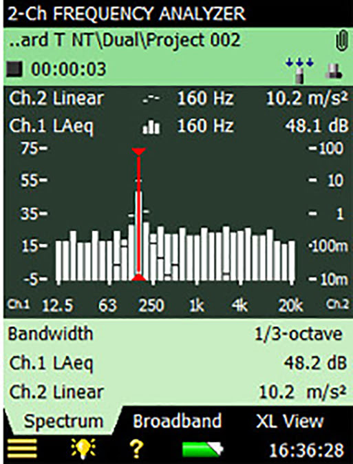 En disposant d'un appareil à deux voies, vous pouvez potentiellement réduire de moitié vos temps de mesure - grâce a deux positions de mesure fonctionnant en simultané - sans faire l'acquisition d’un instrument supplémentaire. Vous pouvez également effectuer une analyse simultanée du bruit et des vibrations pour diagnostiquer les causes principales du bruit.