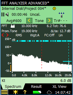 Via la sortie casque, il est également possible d’écouter un ton pur généré à la fréquence de positionnement du curseur sur le spectre FFT et ainsi de le comparer avec le bruit réellement mesuré, façon simple et intuitive de juger subjectivement de la pertinence du résultat.