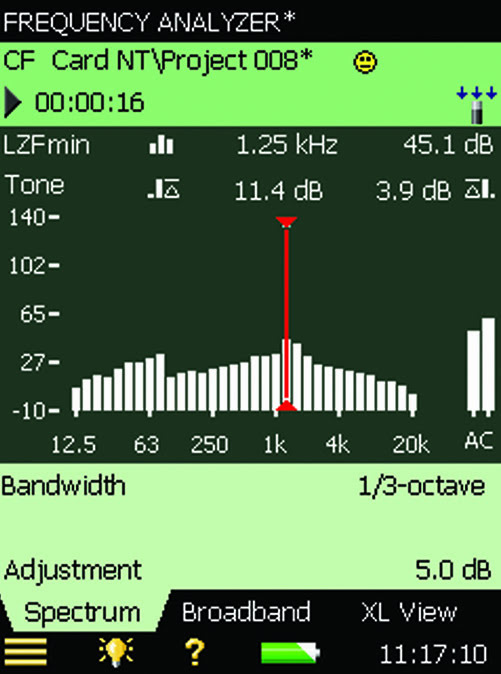 L’analyse est entièrement automatique, identifiant toutes les tonalités dans le spectre mesuré. À la fin de la mesure, les paramètres tonaux pour les tonalités possibles sont calculés puis immédiatement présentés sous la forme d’une liste complète. Le LAeq est mesuré simultanément et le niveau corrigé d’évaluation de la tonalité peut être calculé instantanément sur site.