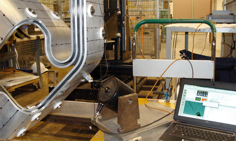 A spare 700 kW horn was used for the testing, geometry was created, and accelerometers set up. Using standard modal testing technology – including triaxial accelerometers, transducers and shakers – approximately 200 points were selected from an existing finite element analysis (FEA) wireframe model to create the experimental modal analysis (EMA) model.