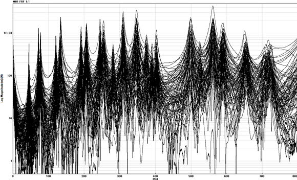 Each curve represents a hammer strike, giving a Frequency Response Function (FRF) for the soundboard. Usually, a large number of peaks is desirable since each represents a natural resonant frequency that amplifies the input – creating a richer sound. The width of each peak is also critical, since it is related to the structural damping and therefore to the sound energy dissipation. In general, the lower the damping the better it is for a guitar’s sound. Luthiers are naturally adept at ensuring this without the aid of frequency spectra.