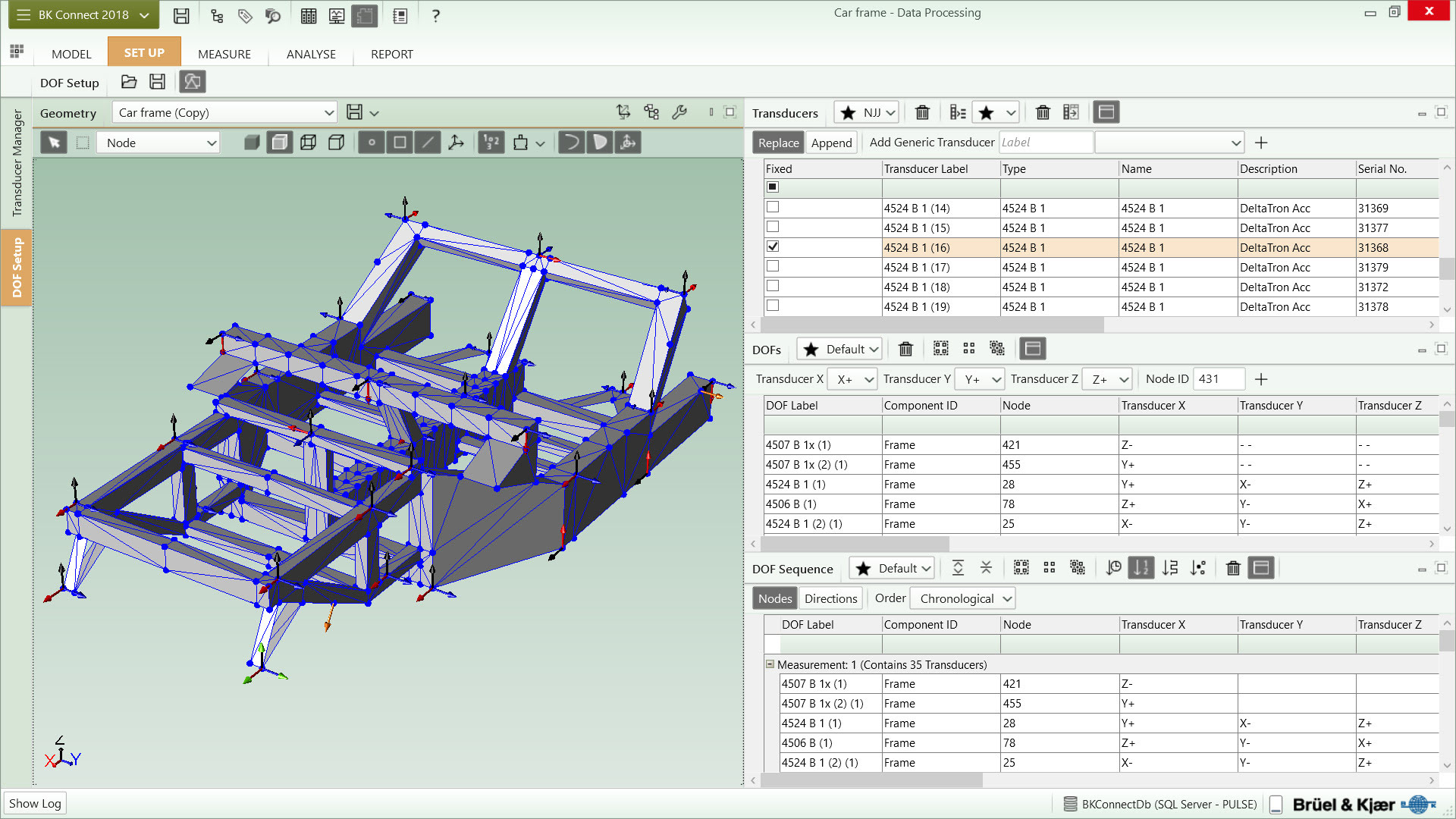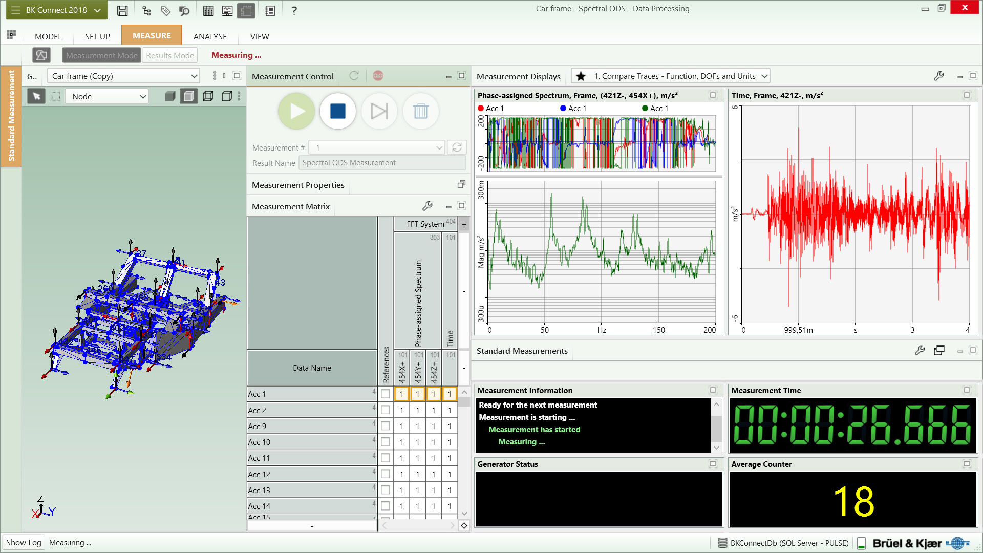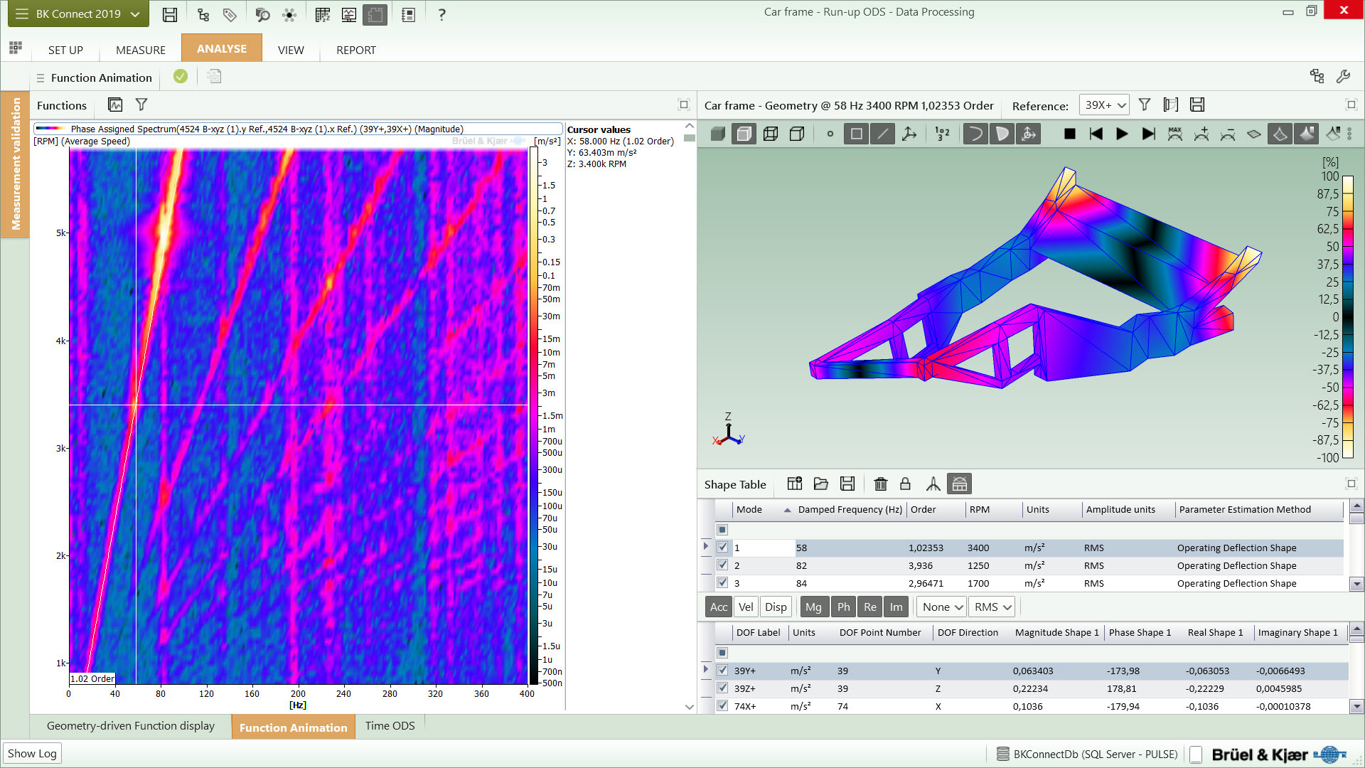 이 BK Connect 소프트웨어는 시간, 스펙트럼, 런-업/다운 ODS에 대한 분석을 수행합니다. 주어진 작동 조건 하에서 구조물의 진동 패턴, 즉 구조물의 동적 특성이 힘 함수에 어떻게 응답하는지 결정합니다. 진동 패턴은 구조물의 애니메이션 형상 모델로 표시될 수 있으며, 형상 표에서 변위, 속도, 가속도로 나열됩니다.
