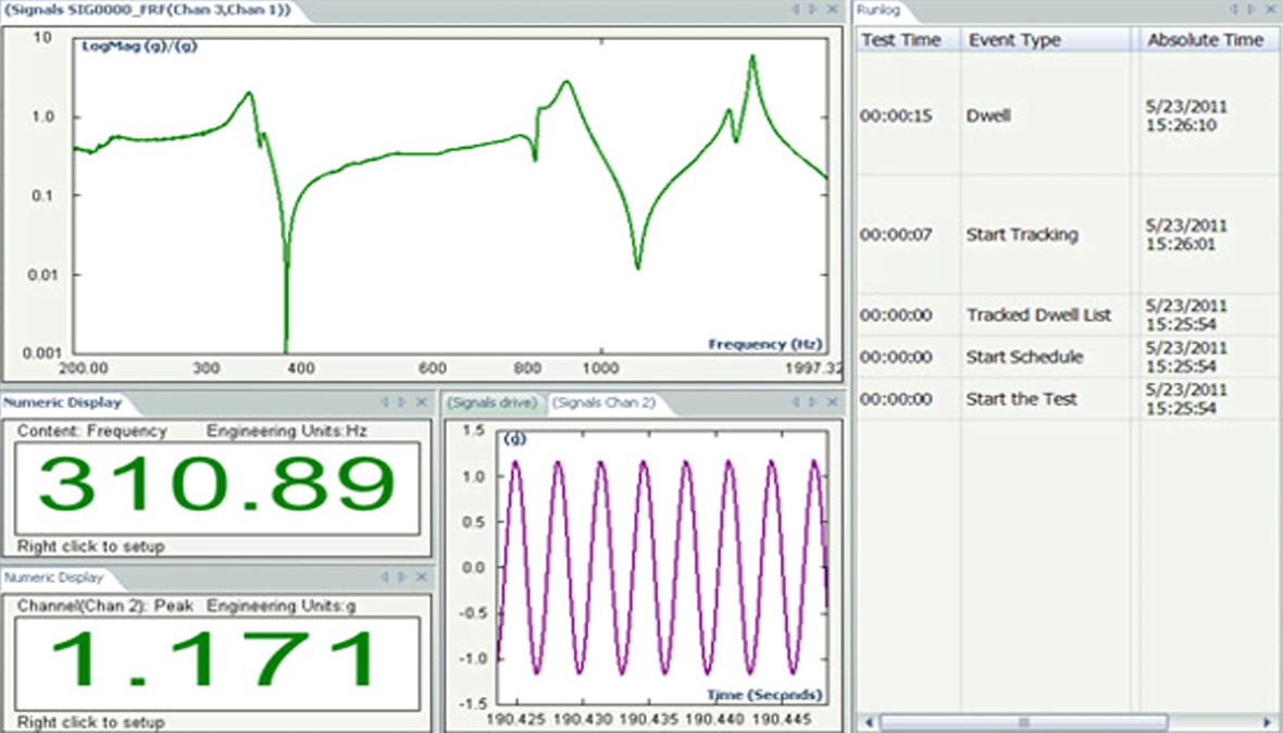 견적 요청하기Resonance search, track, and dwell (RSTD) is an invaluable test for automated fatigue testing. A sine sweep is used to detect the resonant frequencies of the device under test (DUT). The test then dwells upon these frequencies for a specified period or number of cycles, automatically tracking changes in resonance occurring during the test in order to simulate a worst-case fatigue environment.