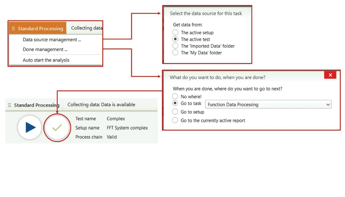 Para analisar e pós-processar dados com eficiência, use cadeias de processo criadas por um especialista em ruído e vibração para pseudo processamento em tempo real ou pós-processamento para a análise de dados de ruído e vibração