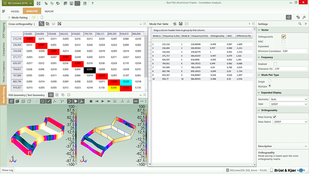 O software lhe ajuda a dimensionar e orientar os dois modelos geométricos para alinhá-los e, assim, facilitar a sua comparação. Você pode animar os vários formatos de modo de teste e de FE e exibir tabelas de modos, para comparar claramente os parâmetros modais. A sincronização de modo é feita automaticamente entre os dois modelos modais, de acordo com o seu grau de correlação de frequência ou de forma.