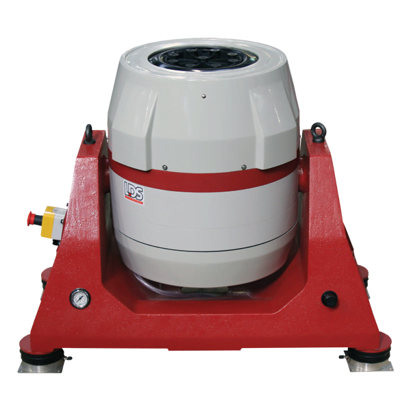 A montagem padrão para este agitador consiste em um munhão sólido de ferro fundido que permite que o eixo de empuxo seja travado na posição vertical ou horizontal. Por sua vez, os apoios do munhão estão equipados com quatro suportes de isolamento de ar para evitar que as vibrações geradas pelo agitador percorram o chão