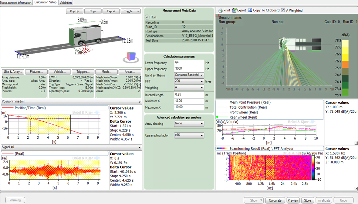 该PULSE软件对移动的道路车辆(如轿车与卡车)所发出的噪声进行噪声源定位。测量出的声学结果以等值云图的形式显示,清晰地显现噪声“热点”,并且显示噪声是如何从各个位置辐射开来的。该噪声图叠加在车辆图之上,从而使用户可以清楚地看到车辆各个部件的噪声级值,如轮胎或侧翼后视镜,并且可以了解声音的指向性。