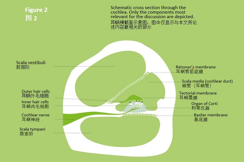 耳蜗横截面详图(见图2)显示了充满淋巴液的第三个腔体——蜗管,蜗管与前庭阶和鼓室阶平行。我们还能看到前庭阶不直接接触基底膜,耳蜗管前庭膜将前庭阶与蜗管分隔开来。